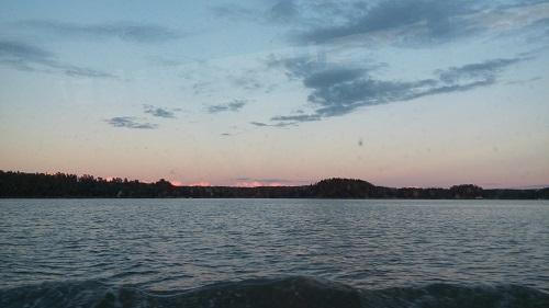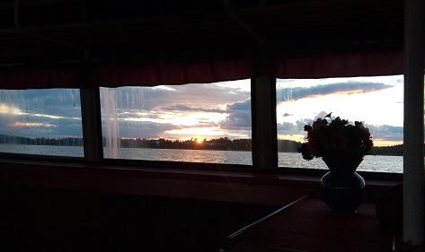 Ilta hämärtyy ja aurinko laskee. Näkymä Sandra-laivalta.